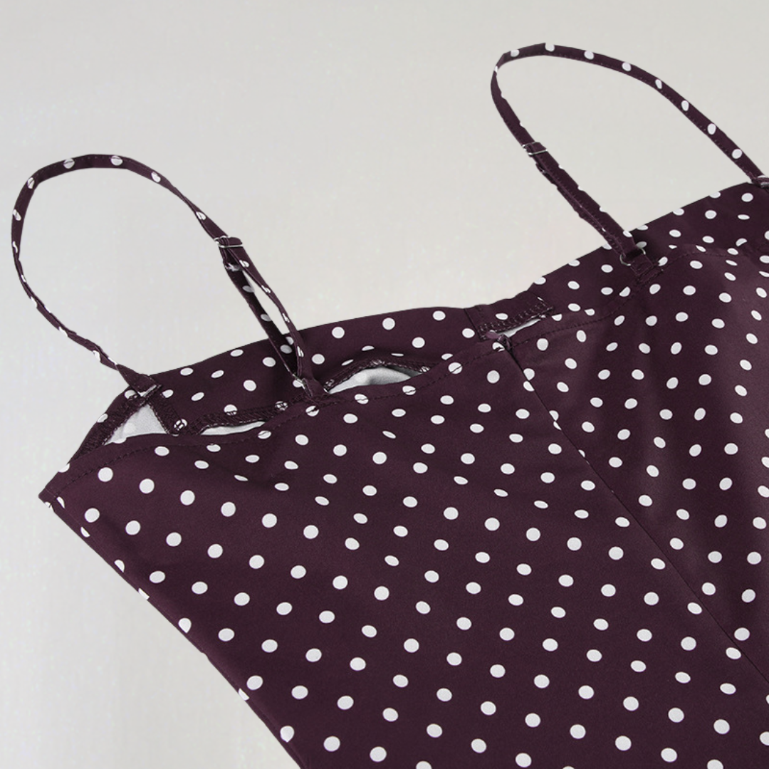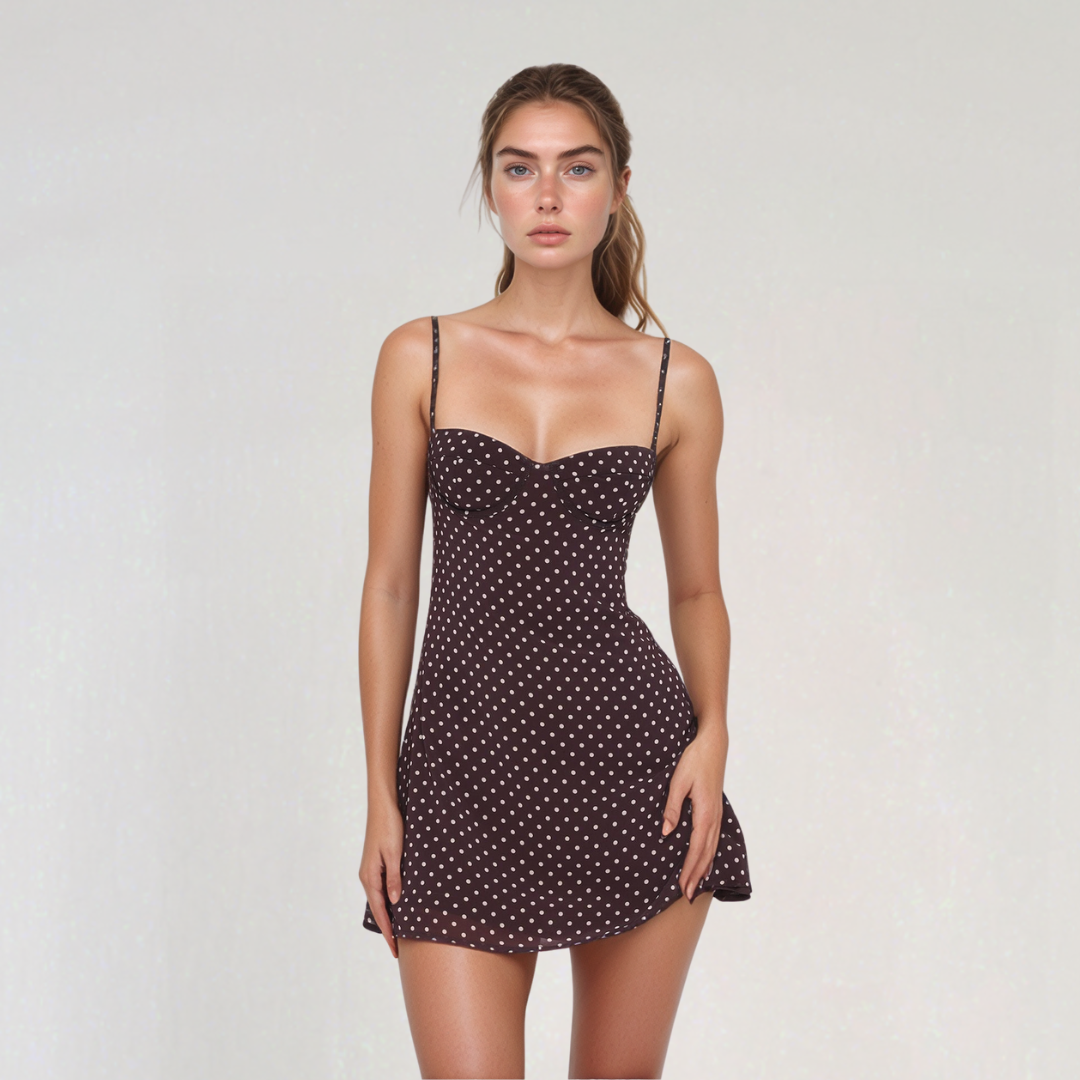 هذا الفستان القصير يجذب الأنظار بقصته النسائية، وحمالاته الرقيقة وفتحة الصدر على شكل قلب. النقشة المنقطة على خلفية الشوكولاتة تعطيه مظهرًا عتيقًا وأنيقًا. مثالي للتألق في الأيام المشمسة أو ليالي الصيف.