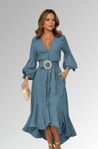 تتميز هذه الفستان الصيفي الطويل بقصّة على شكل A تعانق الجسم برقة. تضيف الأكمام المنتفخة لمسة من الشخصية والأنوثة. مثالي للحظات غير الرسمية وكذلك للمناسبات الأكثر أناقة.