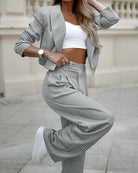 Αυτό το σετ συνδυάζει ένα δομημένο σακάκι με ένα ταιριαστό παντελόνι. Προσφέρει μια κομψή και επαγγελματική σιλουέτα. Ιδανικό για το γραφείο ή για επίσημες περιστάσεις.