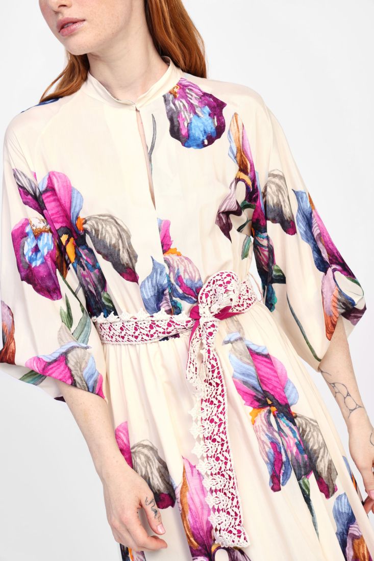 Este vestido largo ofrece una silueta fluida realzada por un delicado cinturón de ganchillo. Su estampado floral aporta un toque de frescura y feminidad. Ideal para eventos, vacaciones o una noche entre amigos.