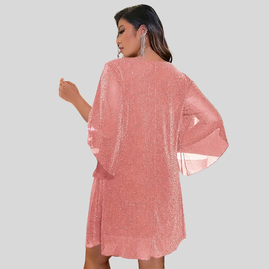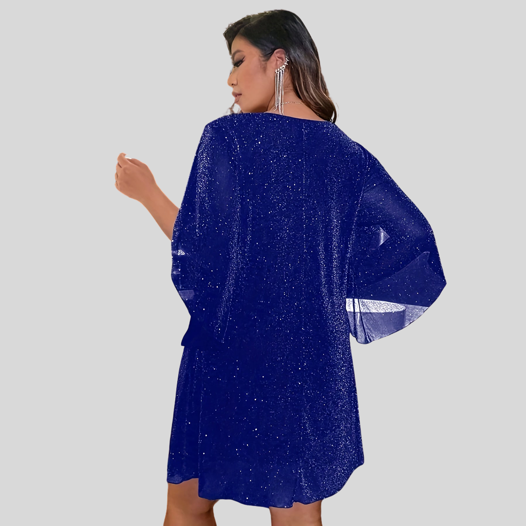 שמלת ערב קצרה מנצנצת זו מושלמת לערבים שלכם. הצווארון בצורת V מדגיש את הסילואט שלכם. זמינה במספר צבעים וגדלים.