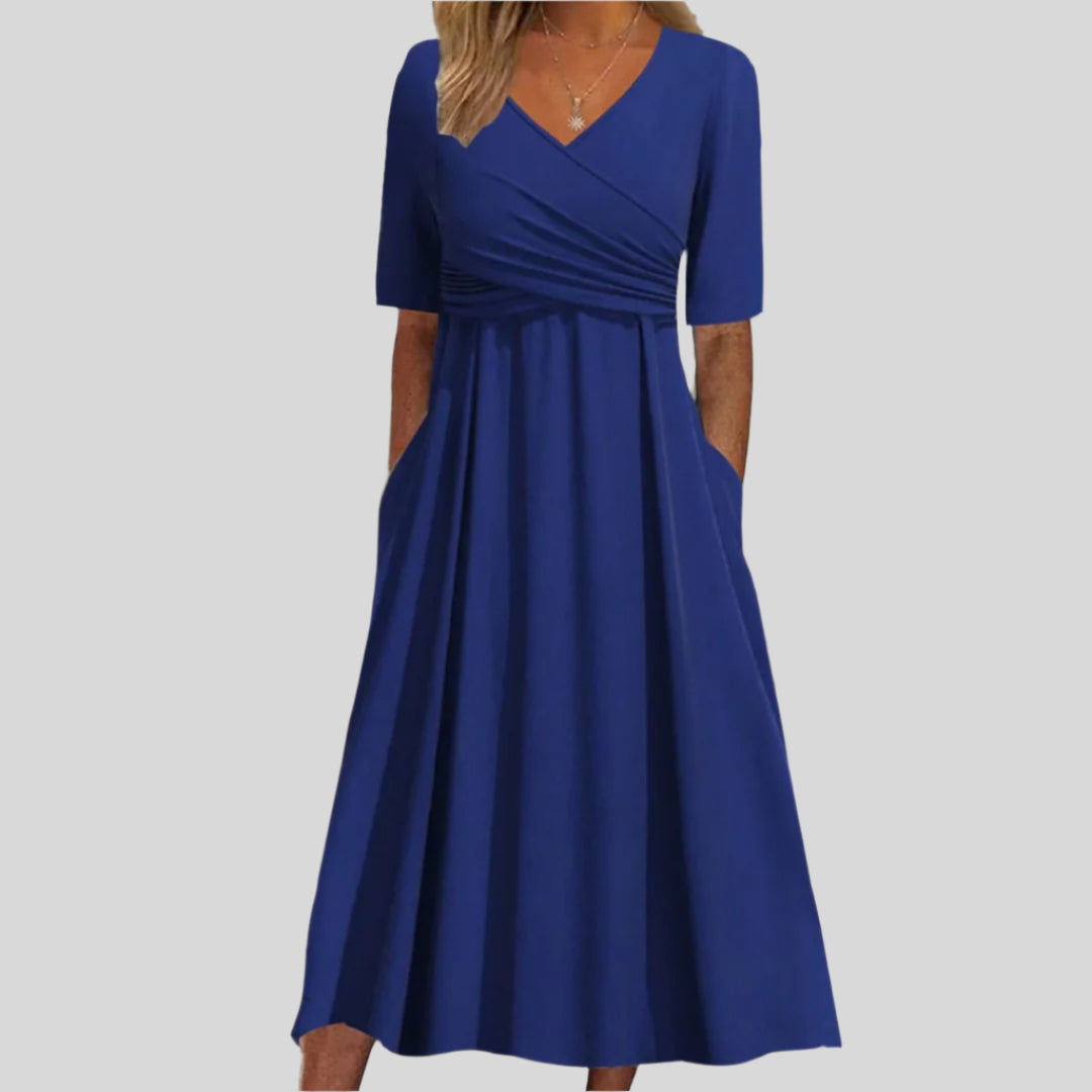 שמלת מקסי זו עם שרוולים קצרים מציעה סילואט מחמיא. העיצוב האלגנטי שלה מתאים למגוון הזדמנויות. זמינה בכמה צבעים כדי להתאים לסגנון שלך.