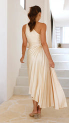 השמלה הארוכה לערב מפתיעה בעיצובה הנועז עם רצועה אחת ובבד הקפיצי העדין שלה. המותן המתאימה מדגישה את הסילואטה באלגנטיות, בעוד שסיום הזרימה שלה מעניק לה מראה מתוחכם. אידיאלית כדי לזרוח באירועים פורמליים או בערבים מיוחדים.