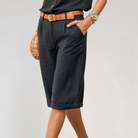 הברמודה בגובה מותן גבוה מציעה דמות אלגנטית ומוארכת. העיצוב שלה עם כיסים צדדיים מעשיים משלב פונקציונליות וסגנון. מושלם לאירועים קיץ שונים, היא מתאימה בקלות לבוש לא רשמי או חצי רשמי.