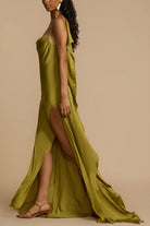 שמלה ארוכה וזורמת זו מדגישה את הסילואט באופן טבעי ואלגנטי. החיתוך המינימליסטי שלה, המודגש בחריצים דיסקרטיים, יוצר איזון מושלם בין צניעות לנשיות. אידיאלית לאירועים מיוחדים או לערבים אלגנטיים.