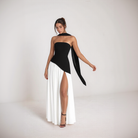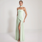 השמלה הארוכה הזו מדגישה את הסילואט בזכות הקורסת המובנית וללא רצועות. החיתוך הצדדי מוסיף נגיעה של נשיות וביטחון. אידיאלית לערבים אלגנטיים, היא משלבת קסם ונוחות.