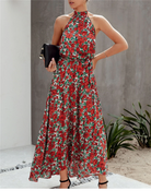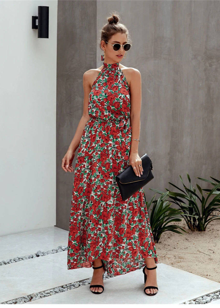 שִׁמְלָה ארוּכָה בסגנון בוהמי שיק מציגה דוגמאות פרחוניות וגזרה זורמת. צווארון גבוה עם סגירה אחורית חושף בעדינות את הכתפיים.
