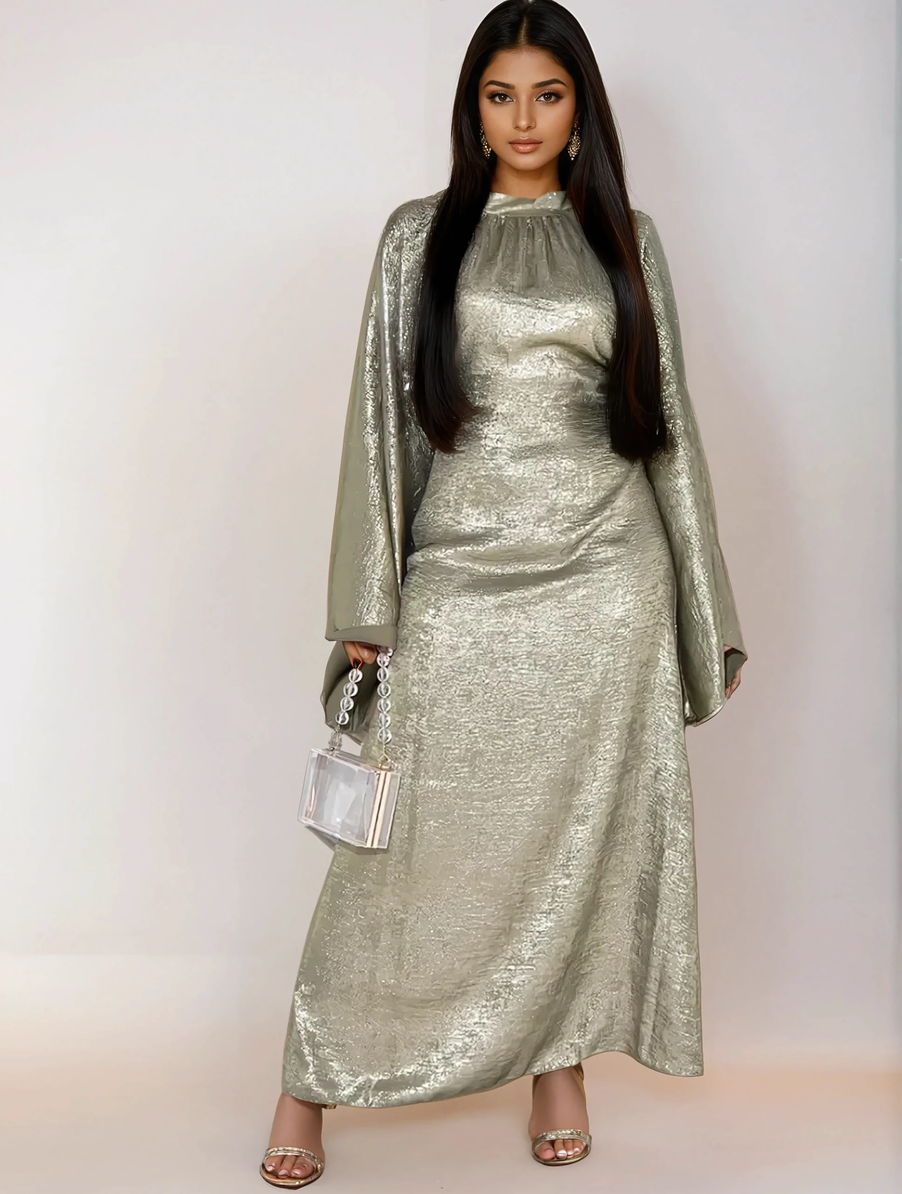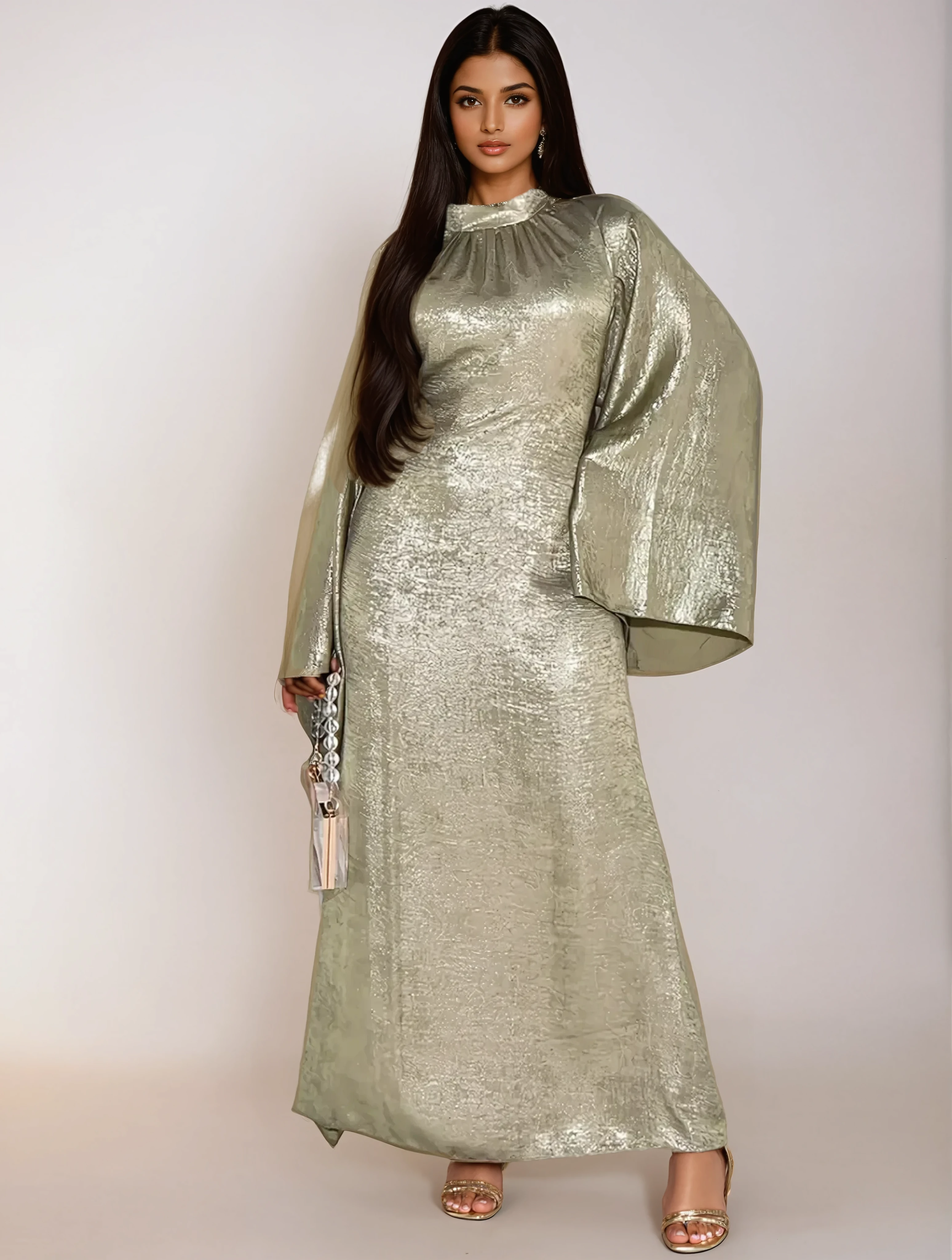 この流れるような現代的なライトグリーンのアバヤドレスで優雅な印象を与えましょう。ロングカット、オペークな生地、柔らかな色合いが特別なイベント、レセプション、またはフォーマルな夜に最適な選択となります。