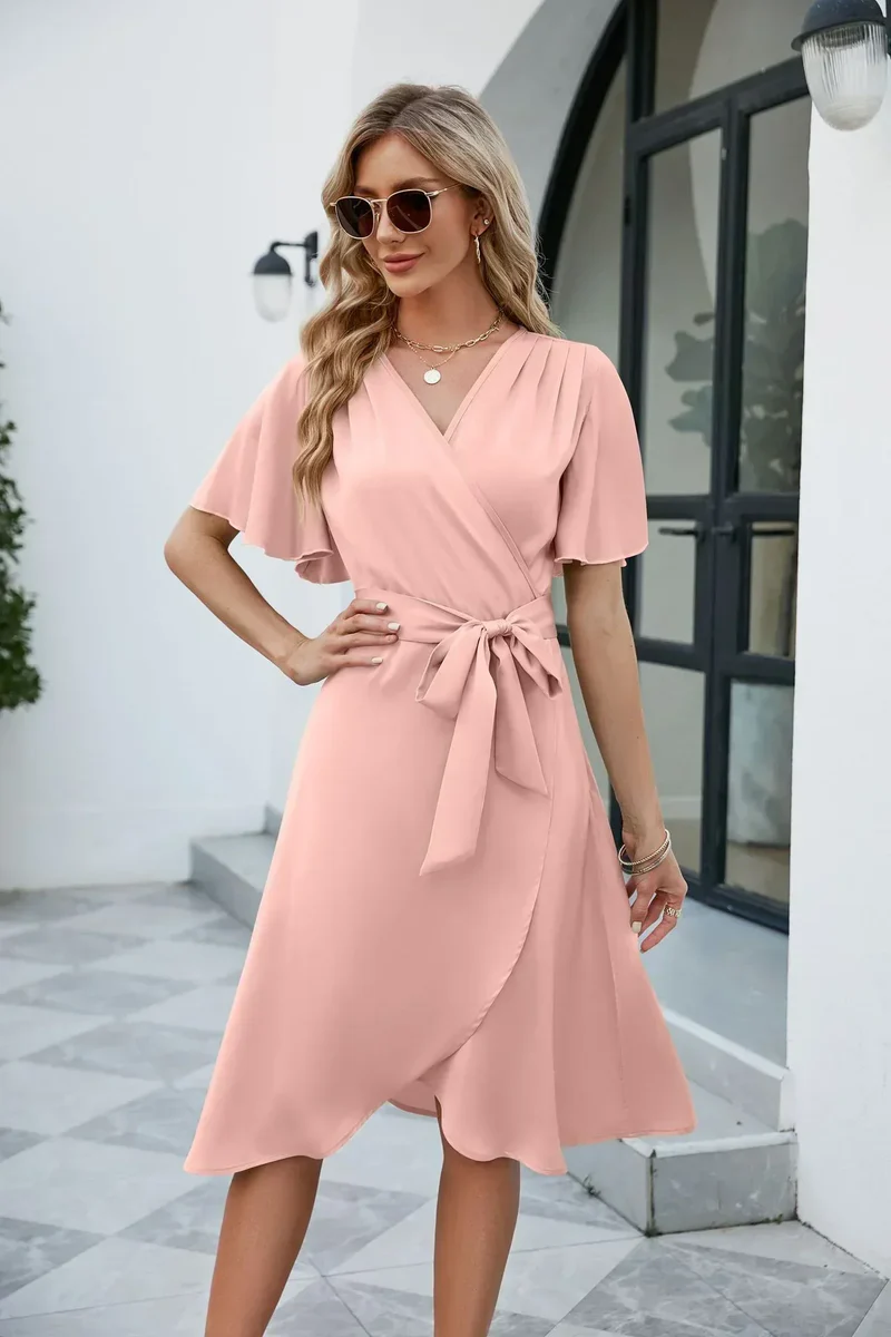 このラップドレスは、魅力的なカットとウエストを引き立てるリボン付きのベルトで魅了します。流れるような袖と軽やかなドレープが、女性らしく自然な印象を与えます。晴れた日のためにも、夜のおしゃれな外出にも最適です。
