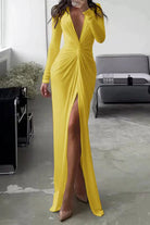 このロングドレスは、エレガントなVネックと胸元の洗練されたプリーツで魅了します。流れるようなカットが体のラインを美しく引き立て、快適さとスタイルを提供します。最も印象的なイベントで輝くための理想的な選択です。
