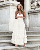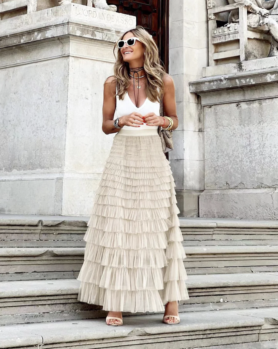 この流れるようなフリルのスカートは、その軽やかな落ち感と体型を引き立てるカットでシルエットを美しく演出します。ボヘミアンシックなスタイルは、晴れた日や特別な場面にぴったりの選択です。軽やかで着心地が良く、あなたの一歩一歩に優雅さを添えます。
