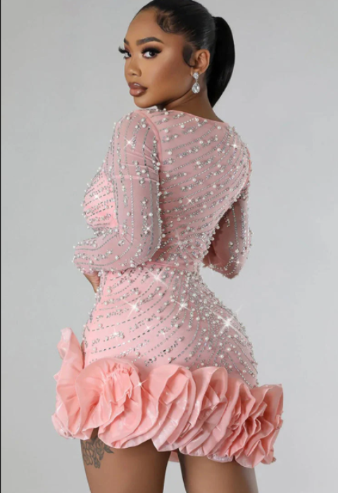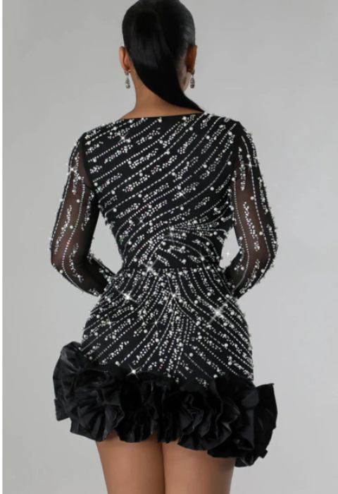 このミニタイトドレスは、きらめくクリスタルで飾られています。深いVネックとフィットした長袖が洗練されたシルエットを提供します。夜のお出かけや特別なイベントにぴったりです。