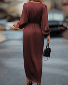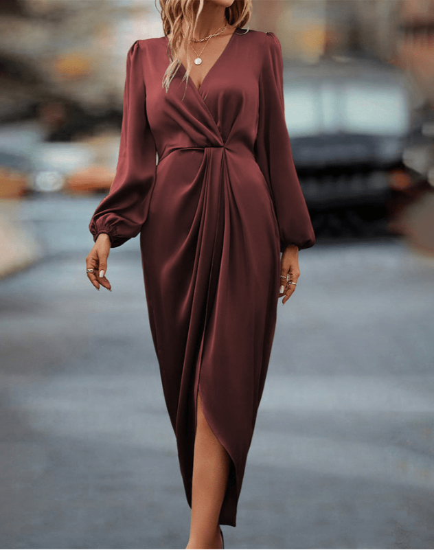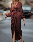 このミディ丈のロングスリーブクロスドレスは、その控えめなエレガンスとフラatteringなカットで魅了します。シックなデザインとフィット感のあるシルエットは、オフィスでも街の外出でも理想的なアイテムです。快適さと洗練の完璧なバランス。