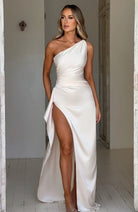 この片肩のイブニングドレスは、そのエレガントな非対称カットで魅了します。魅力的なドレープと高いスリットが、脚を控えめに見せてグラマラスな印象を与えます。最も美しい夜に輝くのに最適です。