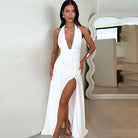 Denne lange kjolen har en dyp utringning og en høy midje som fremhever figuren din. Den dristige splitten og det delikate snøringen tilfører et snev av sofistikert stil. Perfekt for elegante kvelder og spesielle anledninger.