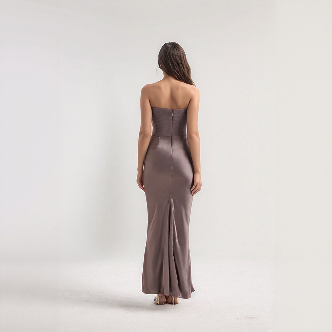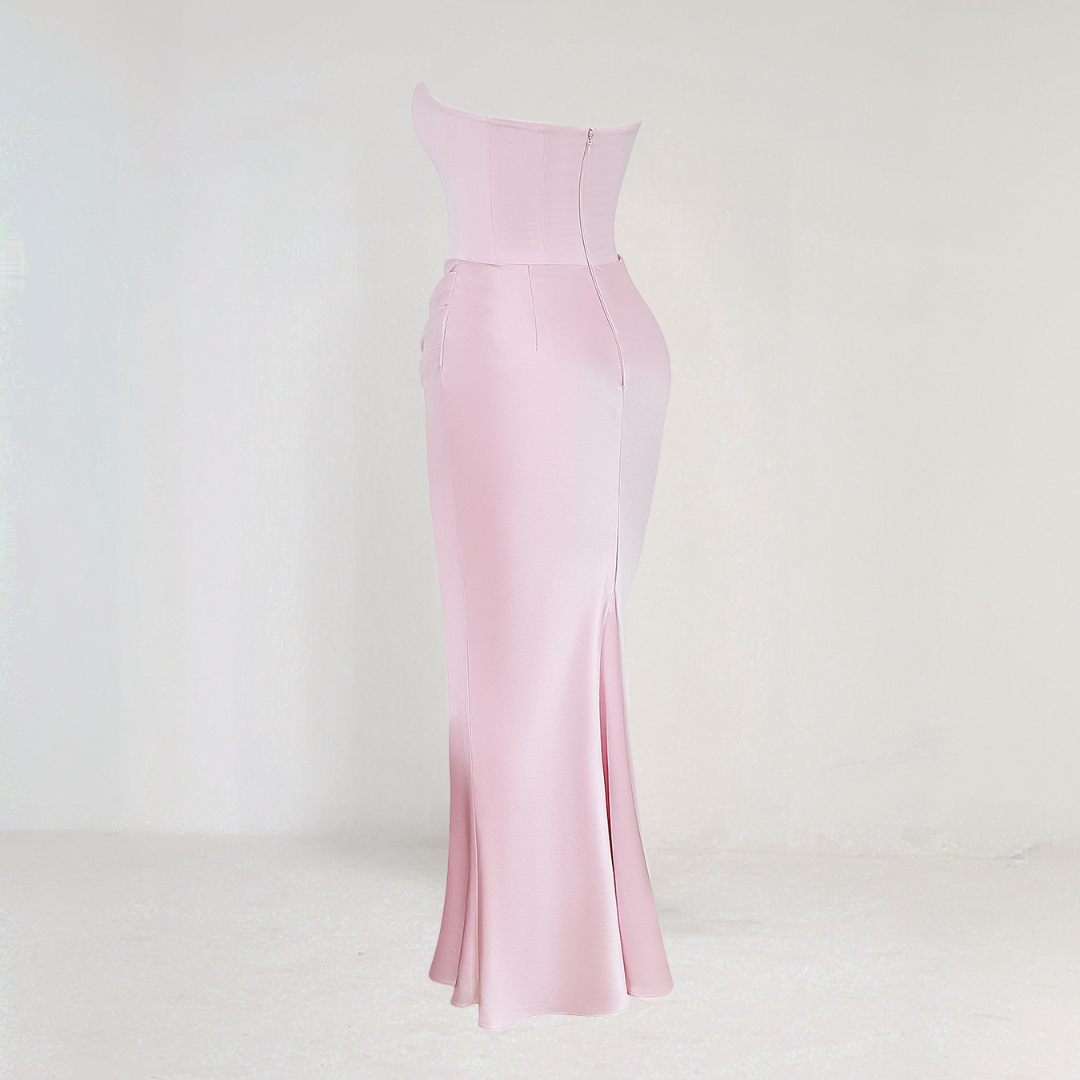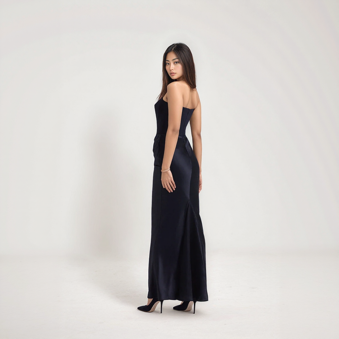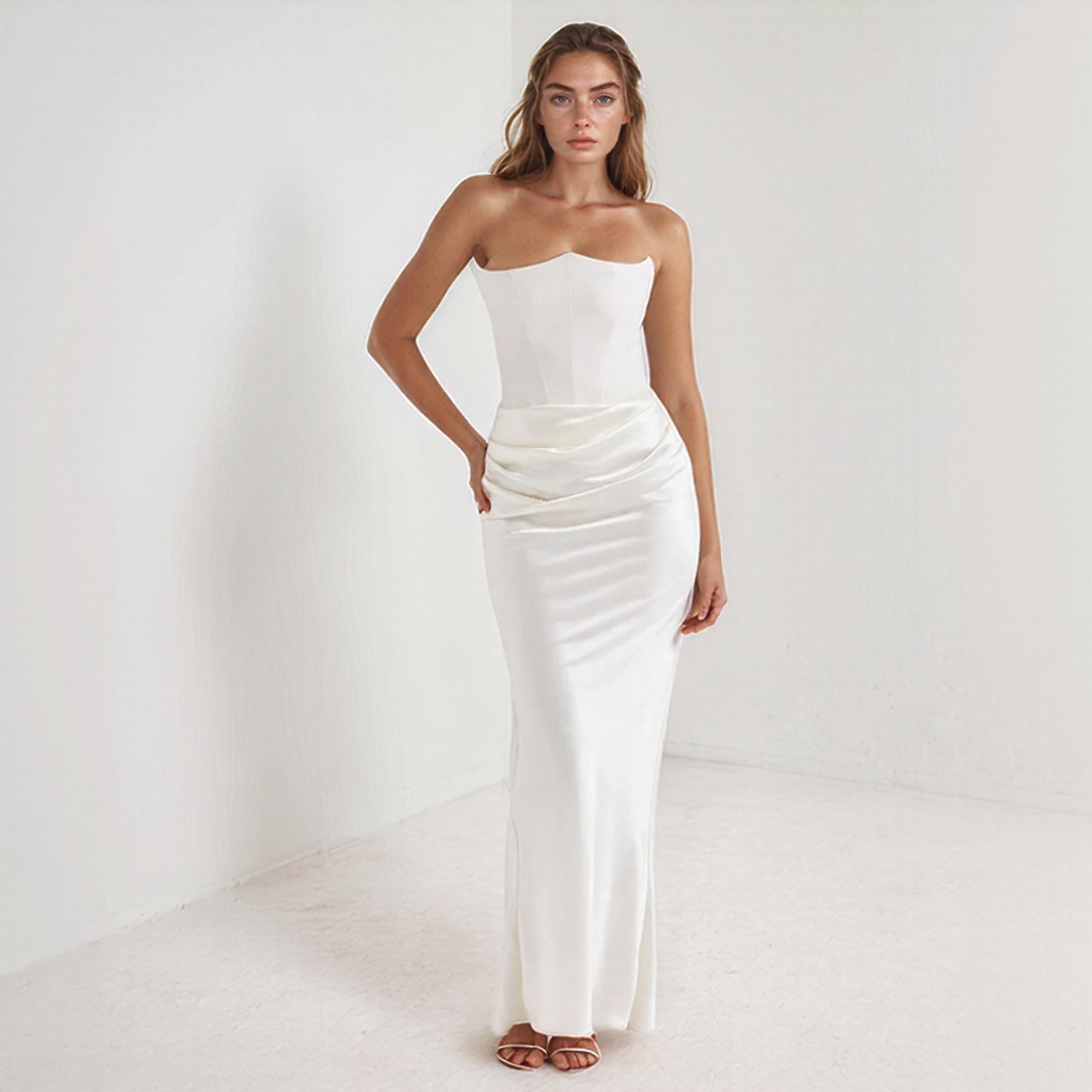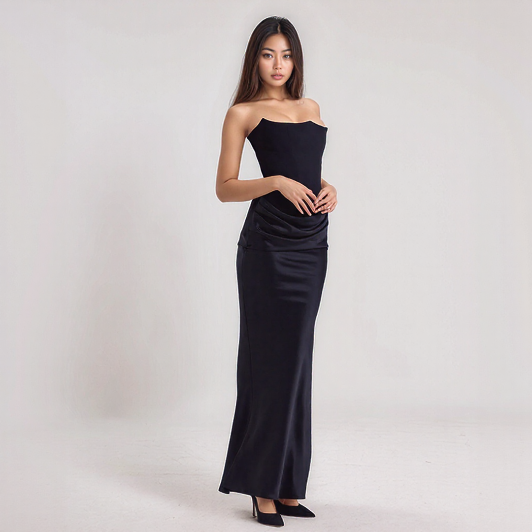 Táto elegantná korzetová šaty zvýrazňuje siluetu vďaka svojmu štruktúrovanému vrchu. Jej bezramienkový dizajn a plynulý strih prinášajú nádych prirodzenej sofistikovanosti. Ideálne na večerné oblečenie a formálne príležitosti.
