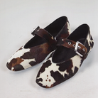 Dessa Mary Jane-skor har ett djärvt koskinnsmönster. De har en elegant spänne för en säker passform. Perfekta för att lägga till en unik touch till din garderob.