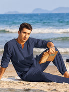 Denna herroutfit förenar stil och välbefinnande. Bestående av ett par byxor och en skjorta, är den perfekt för soliga dagar.